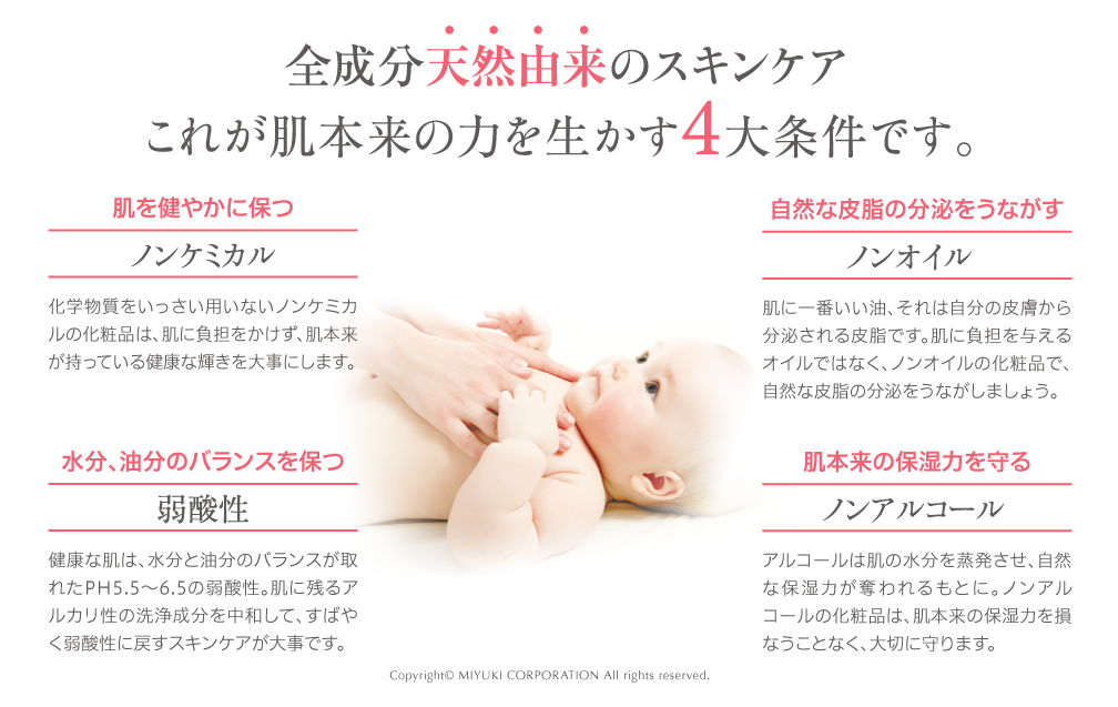 オイルや化学成分で毛穴に蓋をしてしまわないようにノンオイル・ノンアルコール・ノンケミカルのスキンケア商品となっています。